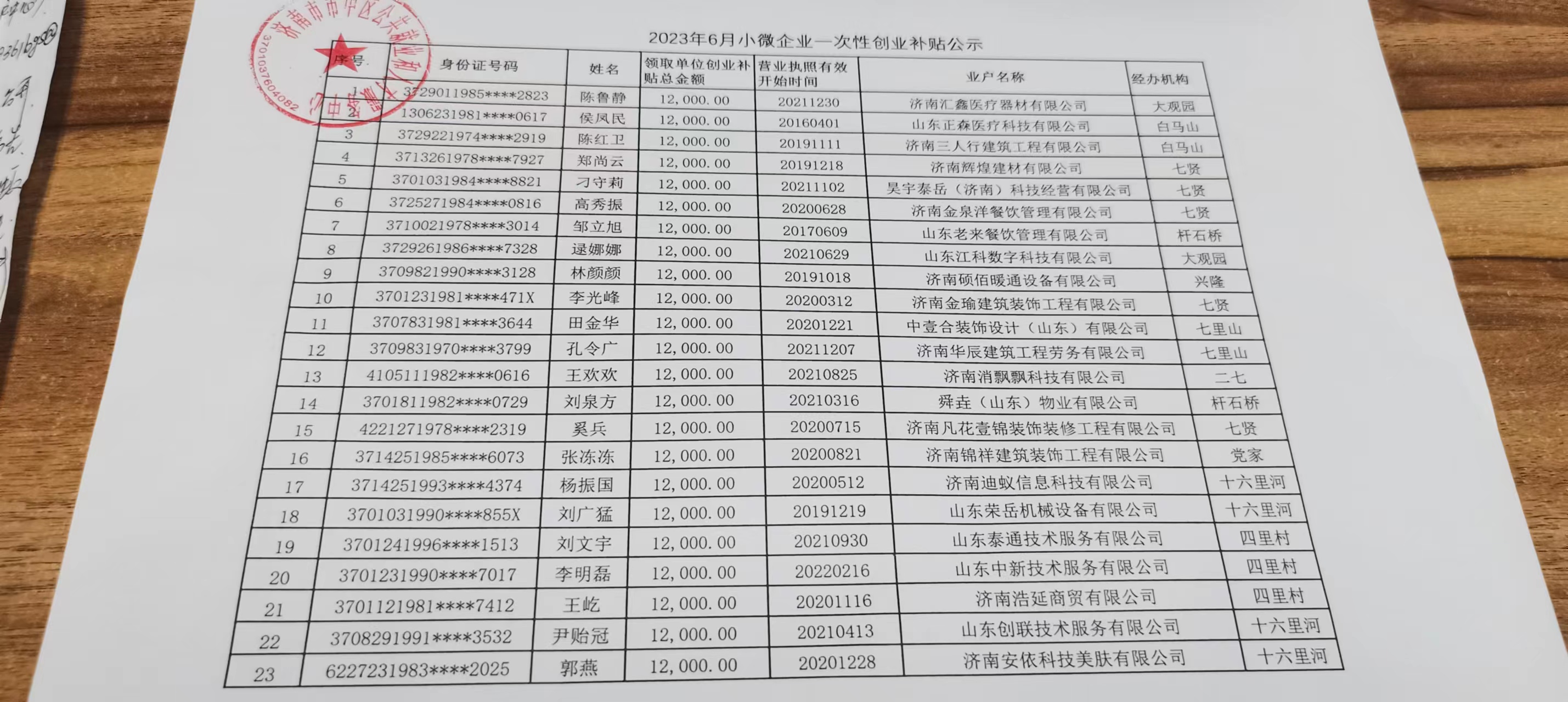 根据《关于印发小微企业新招用高校毕业生一次性奖补办理流程等有关工作流程的通知》济就字〔2019〕6号文件以及济南市人力资源和社会保障局 济南市财政局《关于优化调整小微企业一次性创业补贴政策的通知》济人社发〔2022〕6 号等文件的要求,经审核,23家企业符合小微企业一次性创业补贴的申请发放条件,现公示如下: