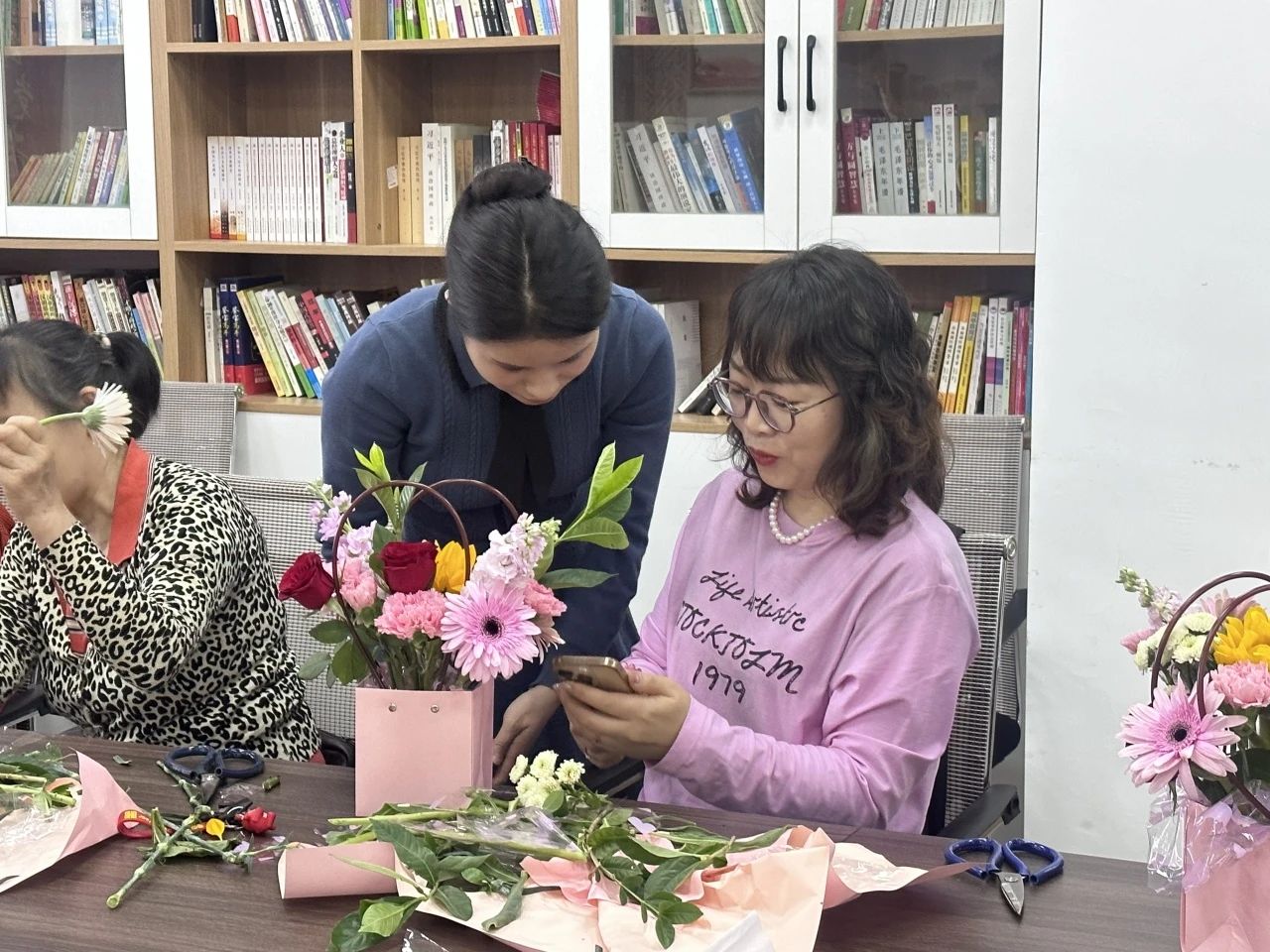 志愿老师向母亲们介绍了艾草的功效和使用方法,随后大家在老师的指导下积极动手,一步一步制作养生锤。经过一个多小时的努力,一只只漂亮实用的艾草锤在妈妈们手中诞生。大家纷纷表示,这次活动不仅是制作一把艾草中药锤,还学习了穴位知识,帮助她们更好地管理自身健康,预防疾病。 二、花香送祝福 爱就在身边 街道办事处开展“花香送祝福 爱就在身边”插花活动,营造了歌颂母爱、感恩母亲的节日氛围。