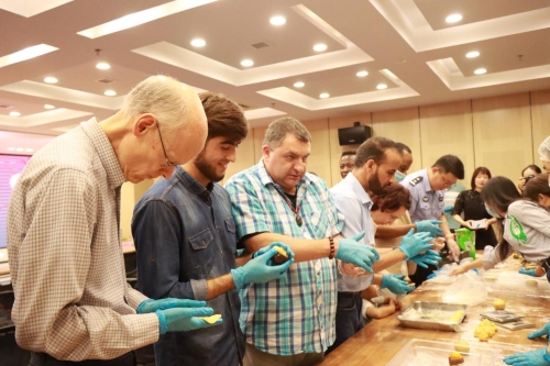 Then, the headquarters space invited two pastry chefs to teach the guests to do the moon cake. Through knead the crust, filling, mold pressing, exquisite Cantonese moon cakes were made. With the pastry chef's demonstration, everybody were enthusiastic, eager to try and had hands-on experience.