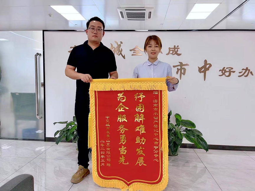 近日,中交城市发展(山东)有限公司的代表满怀感激之情来到济南市不动产登记中心市中分中心,将一面印有“纾困解难助发展 为企服务勇当先”的锦旗郑重地交到工作人员手中,以表达对不动产市中分中心在助力企业发展过程中高效服务的诚挚感谢。