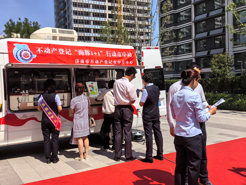 三是流动服务车进社区。海豚小分队跟随流动服务车进驻社区上门宣传“交房即办证”工作。购房人根据自身情况既可以现场办理,又可以下载“爱山东”手机APP线上办理,若线上线下办理都有困难的,还可以申请“云柜台”服务,由帮办专员视频见证为购房人办证。通过线上线下相结合的方式为因种种原因不便自行办理不动产权证书的群众办理业务,打通老百姓办理不动产权证的“最后一公里”。
