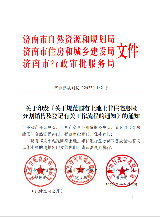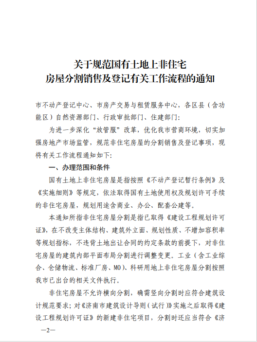 济南市自然资源和规划局 济南市住房和城乡建设局 济南市行政审批服务局等3个部门关于印发《关于规范国有土地上非住宅房屋分割销售及登记有关工作流程的通知》的通知
