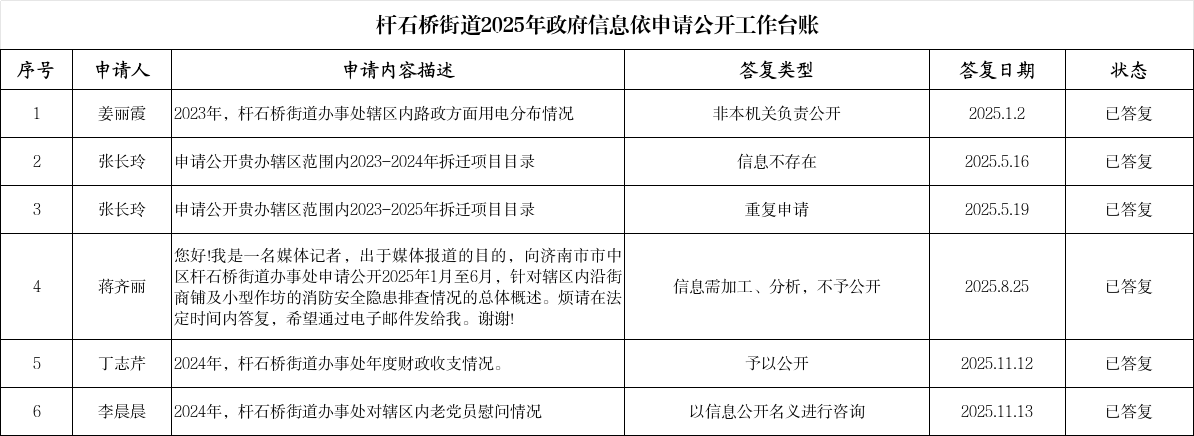 街道健全依申请公开全流程管理机制,严格落实受理、审查、办理、答复等各环节要求,建立申请事项台账,规范办理流程,确保答复合法合规、及时准确。2025年共收到政府信息公开申请5件,上年结转政府信息公开申请1件,已全部按期办结,答复率100%,未出现超期答复情况。未发生有关政府信息公开行政复议和行政诉讼情况。