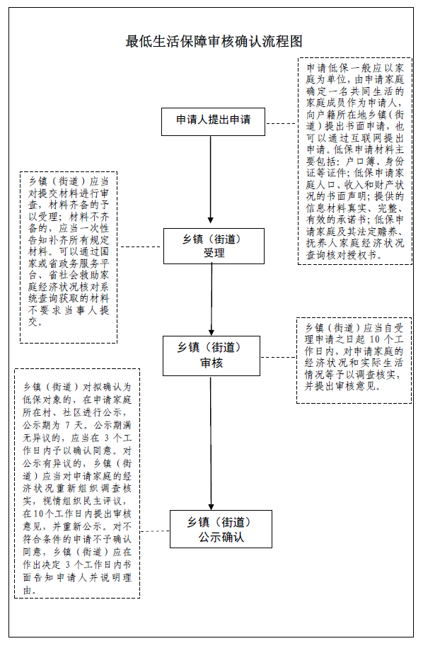 申请人按规定提交户口簿、身份证等证件;签署申请低保家庭经济状况查询核对授权书,授权低保经办机构查询核对。街道应当自出具受理通知书之日起3个工作日内,在村(居)委会协助下,组织工作人员入户调查核实,完成申请人家庭生活状况评估工作。街道在入户调查后2个工作日内作出审批决定。拟批准的,通知申请地的村、社区公布户主姓名、保障人数、居住村(居)、救助金额、监督举报电话、街道公章、公示时间等,公布时间为 7 天。公布期满无异议的,街道应当在3个工作日内作出书面批准决定,确定保障金额、从批准之日次月起发放低保补助金。